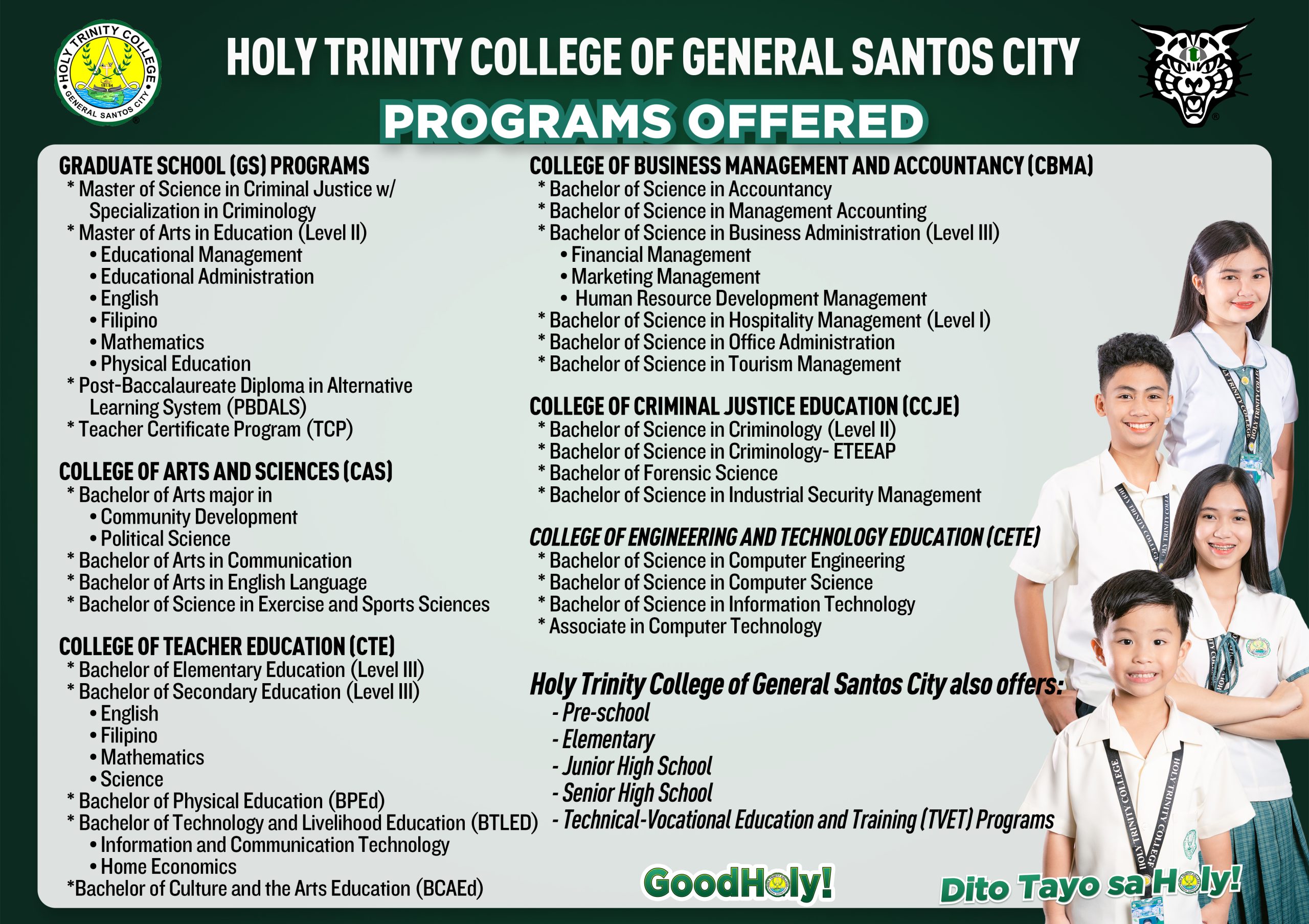 Through its various department, Holy Trinity College of General Santos City offers incoming students a wide choice of degrees many of which have passed scrutiny from top accreditation group such as ACSCU. Most of its faculty have a Master’s or Doctor’s degree and the School can boast of very good facilities. Its Basic Education Department is above-standard.